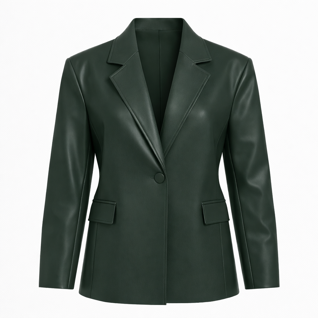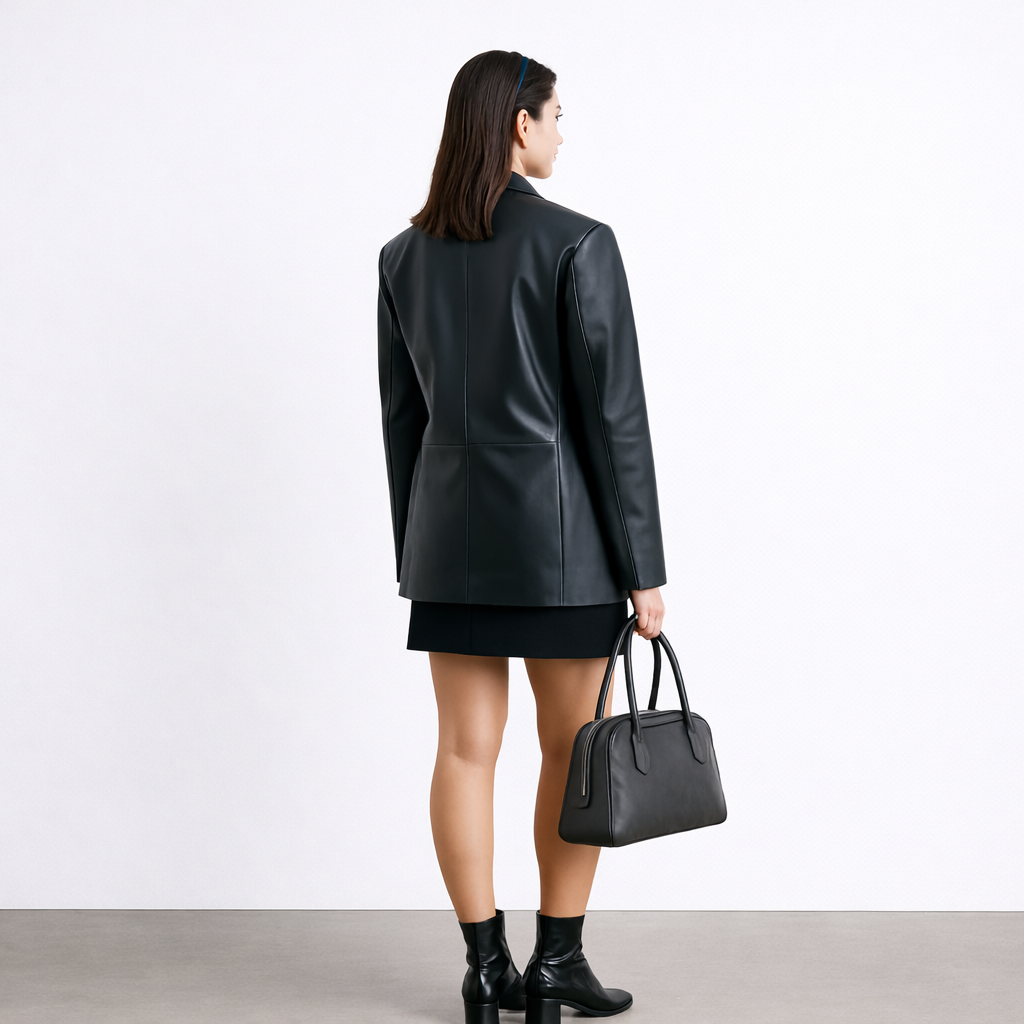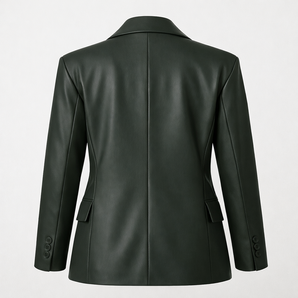Command every room with sharp tailoring, padded shoulders, and a longline silhouette in luxe faux leather. Sleek, sculpted, and effortlessly polished