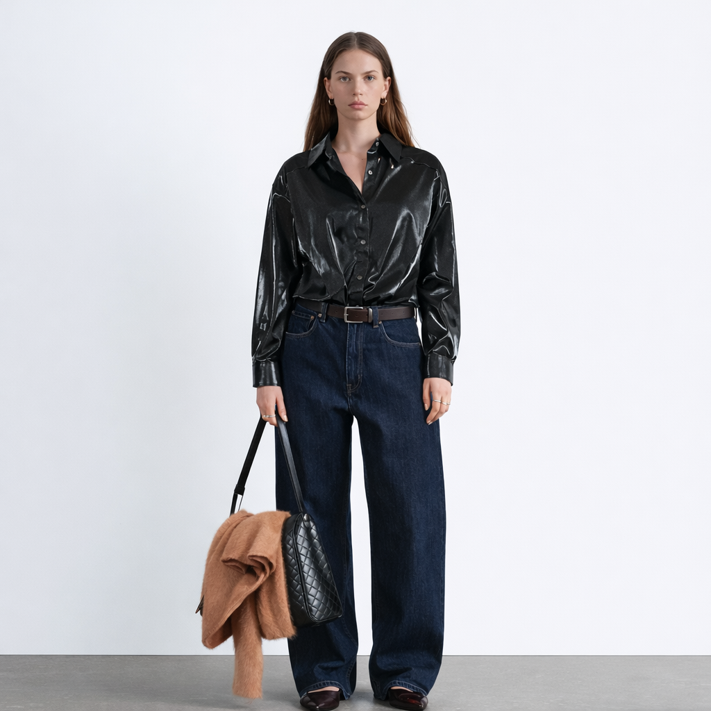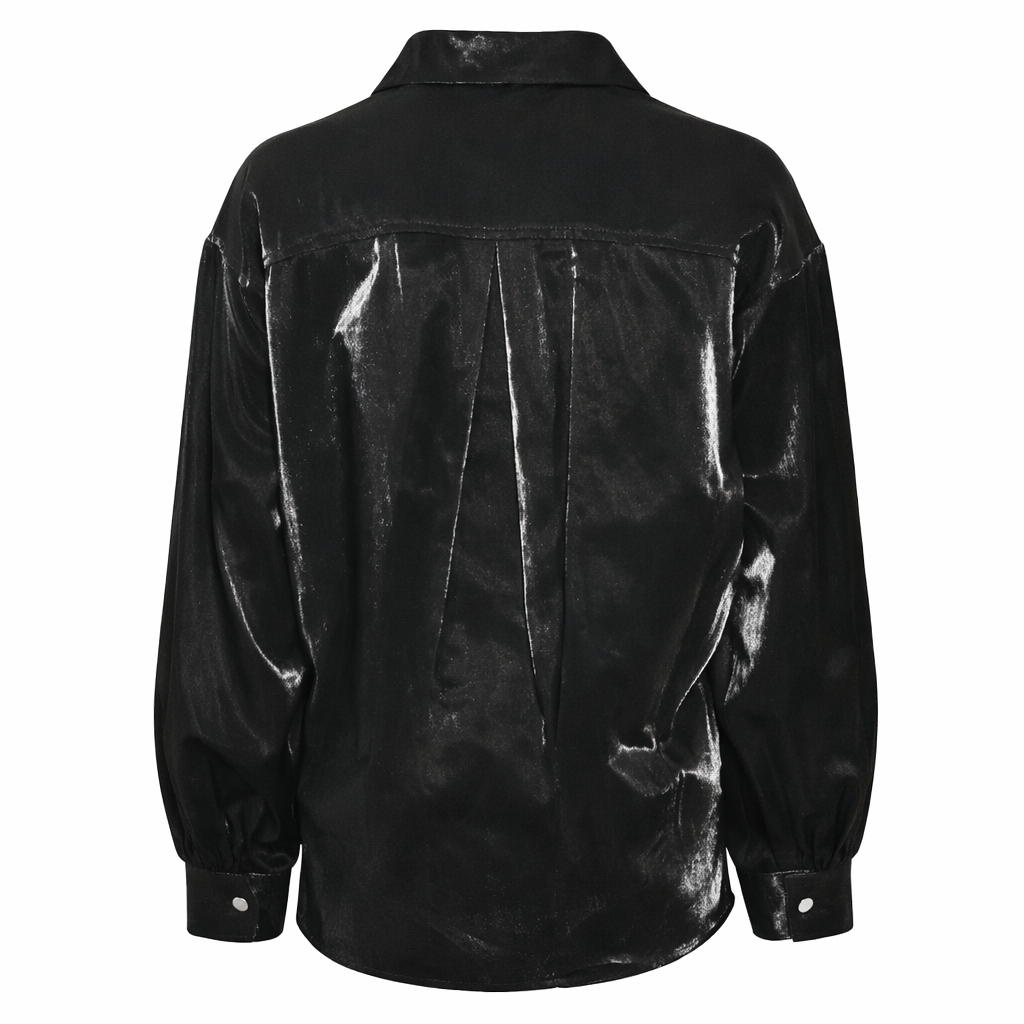 A liquid metallic statement with an oversized fit, button-front design, and soft balloon sleeves—effortless glamour, day to night.